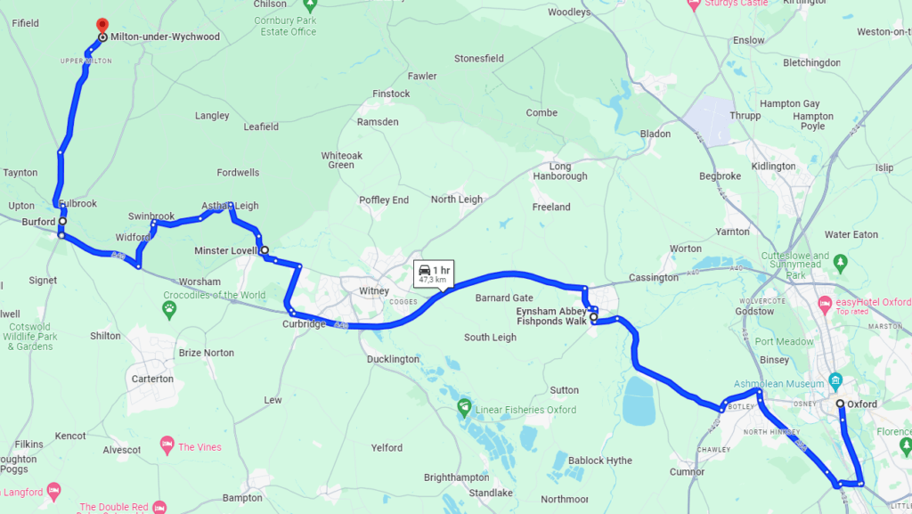 I could not believe how much effort they went through merely to visit their hometown. If the trip were made today, the distance between Oxford and Milton-under-Wychwood would be 39.5 km. A mere one-hour drive. Yes, I checked Google Maps.